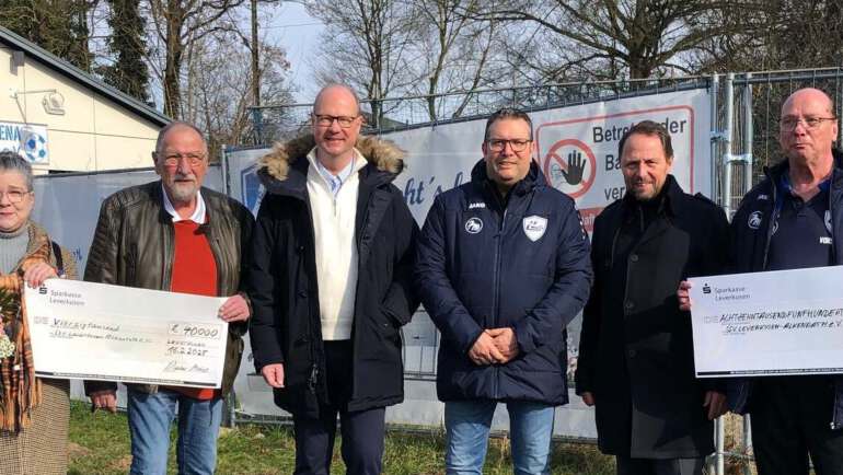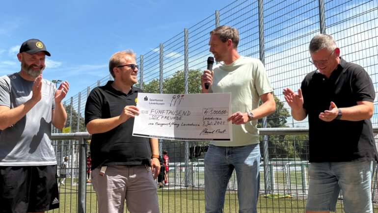 Auf dem Foto ist die U15 II vom SV Schlebusch mit seinen beiden Trainern Carsten Ellinghaus und Tobias Balduan zu sehen. Zur symbolischen Spendenübergabe hat Manuel Bast von der Bürgerstiftung…